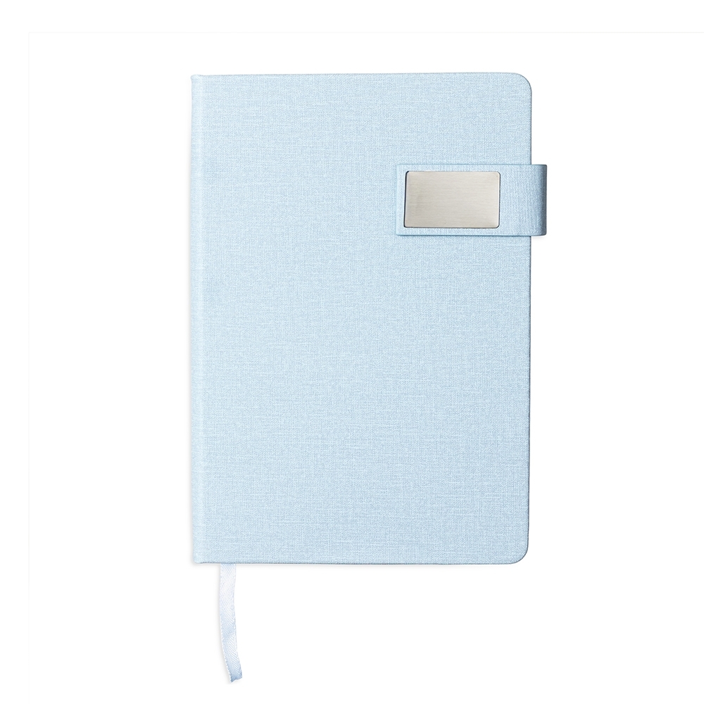 Caderneta capa dura em couro sintético com fecho magnético, placa metálica personalizável, além de marca-página em fita de cetim e aproximadamente 96 folhas brancas pautadas.