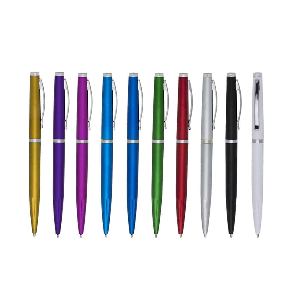 Caneta plástica com carga esferográfica azul e acionamento por rotação. OBS.: PEDIDOS MÍNIMO DE 50 PEÇAS!