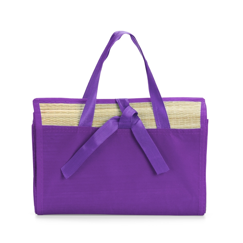 Esteira dobrável em palha sintética com bordas costuradas em nylon dividindo a esteira em três partes. Além disso, possui um par de alças costuradas para transporte.