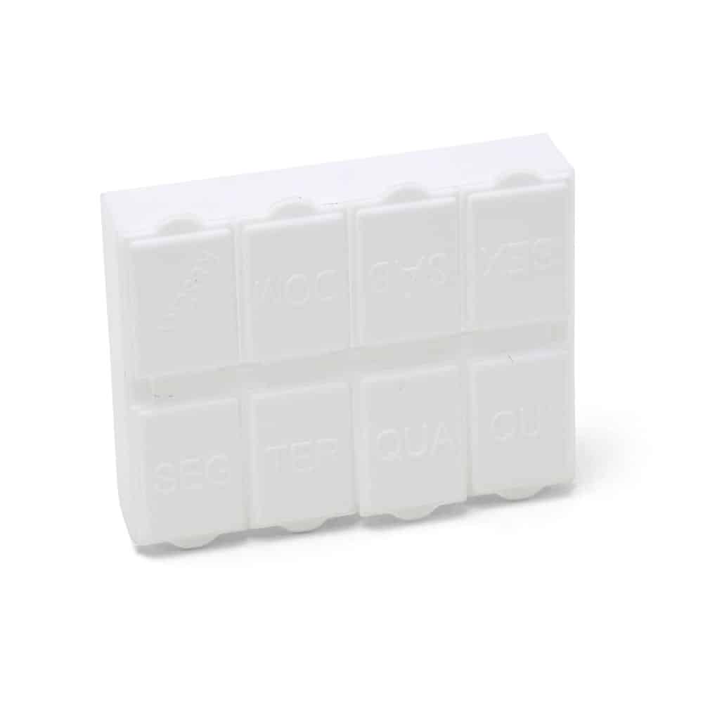 Porta comprimidos semanal de plástico branco fosco. Possui oito divisórias, sete delas escrito em relevo os dias da semana e a última escrito reserva. Verso liso. OBS.: PEDIDO MÍNIMO DE 50 PEÇAS!