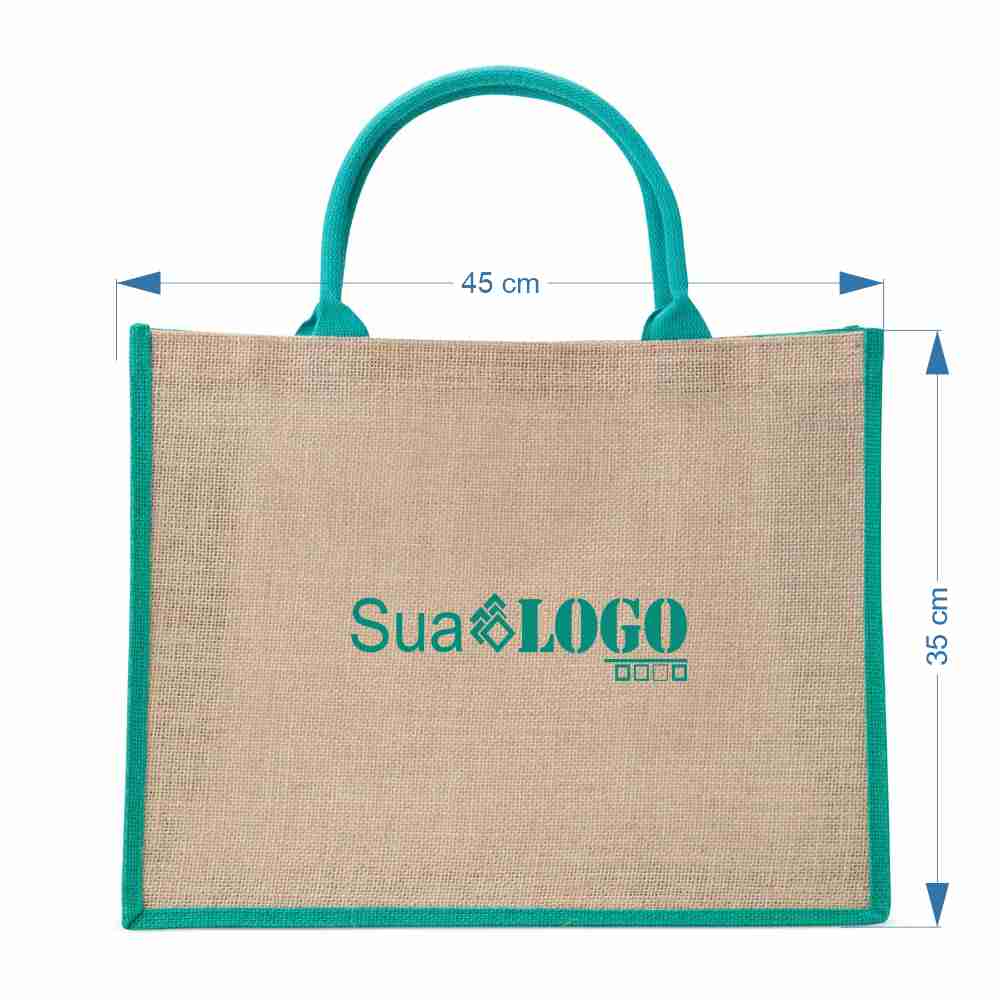 Sacola ecológica confeccionada em juta com alças costuradas na parte interna.